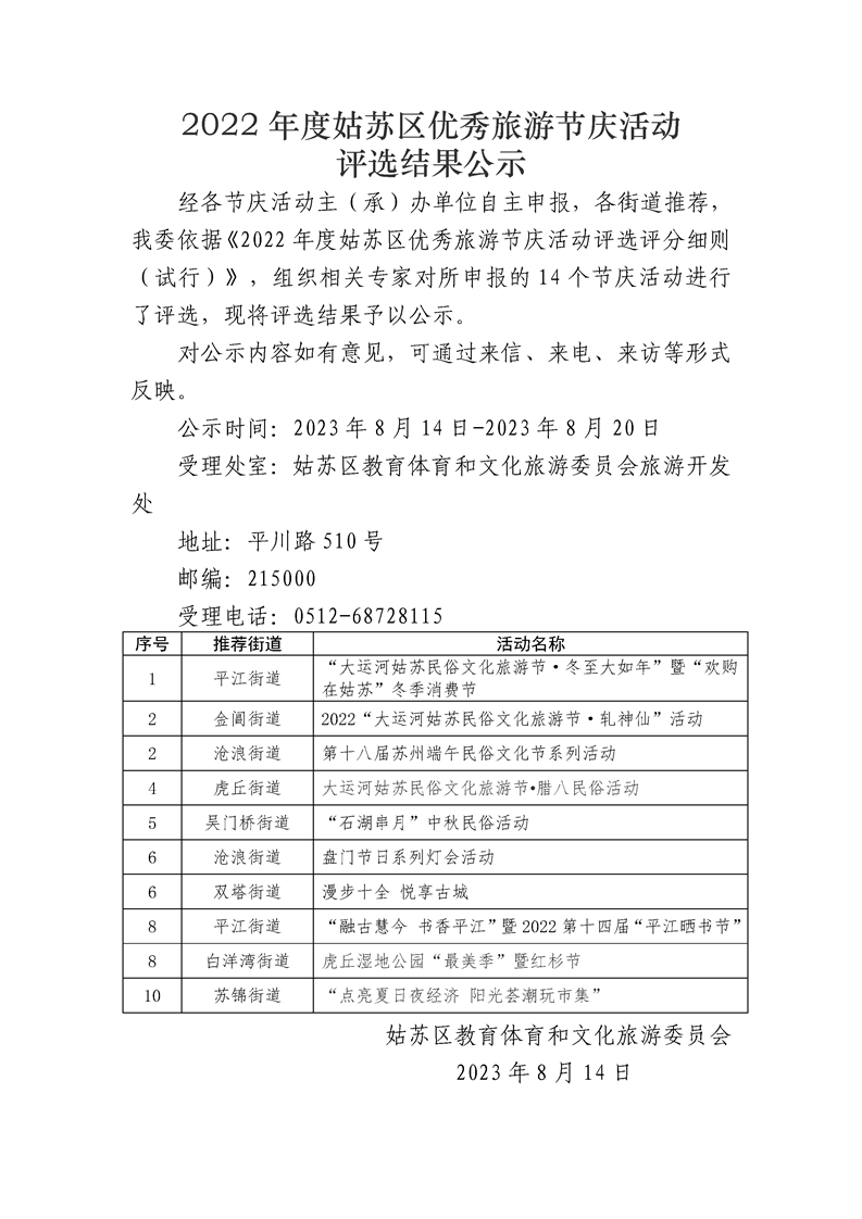 2022 年度姑蘇區(qū)優(yōu)秀旅游節(jié)慶活動評選結(jié)果公示